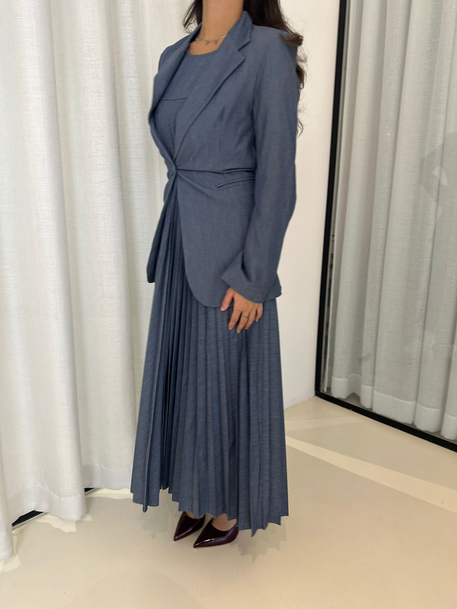 A classic set of a pleated dress and blazer.maxi dress with loosely fitted blazer that both pieces can be used separately